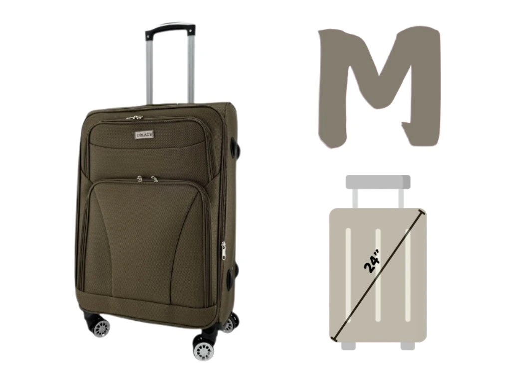 - M Rozměry—Vnější: 65 × 44 × 28 cm (Výška × Délka × Šířka), Vnitřní(měřeno uvnitř skořepiny kufru): 54 × 40 × 20 cm; Hmotnost: kolem 2,7kg(včetně koleček); Objem: cca 60-62 l