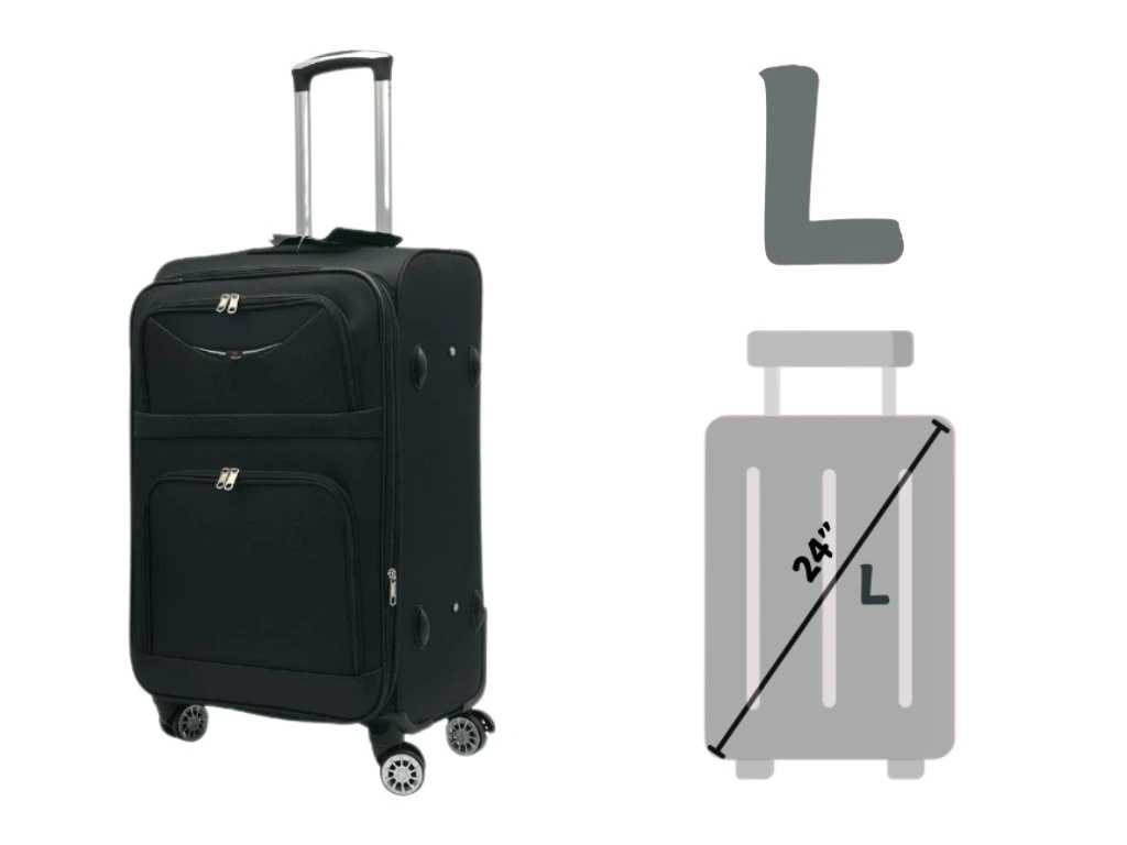 - L Rozměry—Vnější: 67 × 45 × 29 cm (Výška × Délka × Šířka), Vnitřní(měřeno uvnitř skořepiny kufru): 54 × 40 × 20 cm; Hmotnost: kolem 2,7kg(včetně koleček); Objem: cca 60-62 l