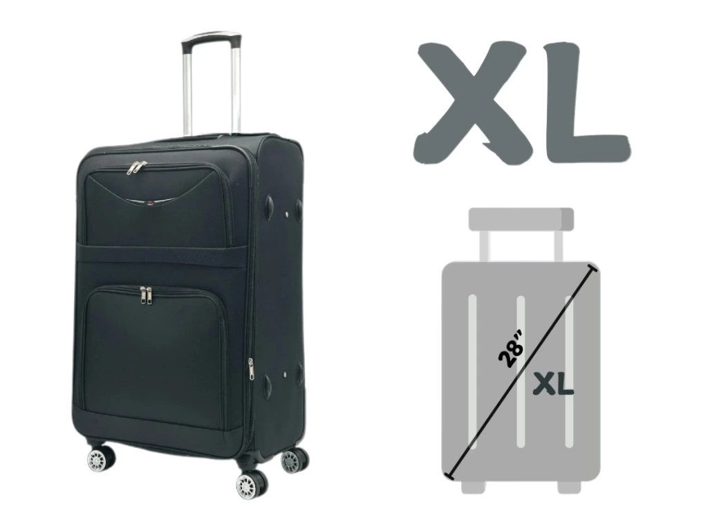 - XL Rozměry—Vnější: 78 × 50 × 31 cm (Výška × Délka × Šířka), Vnitřní(měřeno uvnitř skořepiny kufru): 66 × 44 × 23 cm; Hmotnost: kolem 3,8kg(včetně koleček); Objem: cca 90-95 l