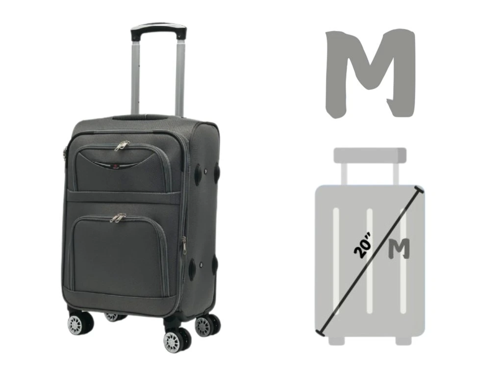 - M Rozměry—Vnější: 58 × 40 × 25 cm (Výška × Délka × Šířka), Vnitřní(měřeno uvnitř skořepiny kufru): 45 × 34 × 17 cm; Hmotnost: kolem 2,6kg(včetně koleček); Objem: cca 35-38 l