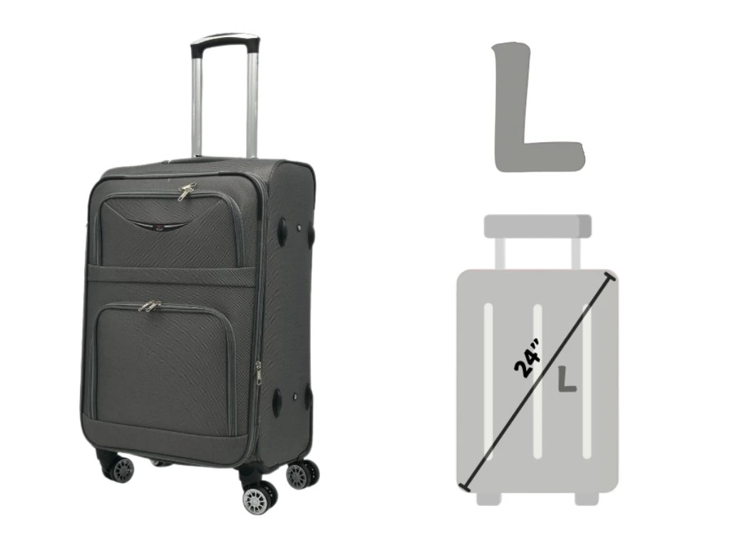 - L Rozměry—Vnější: 67 × 45 × 29 cm (Výška × Délka × Šířka), Vnitřní(měřeno uvnitř skořepiny kufru): 54 × 40 × 20 cm; Hmotnost: kolem 2,7kg(včetně koleček); Objem: cca 60-62 l